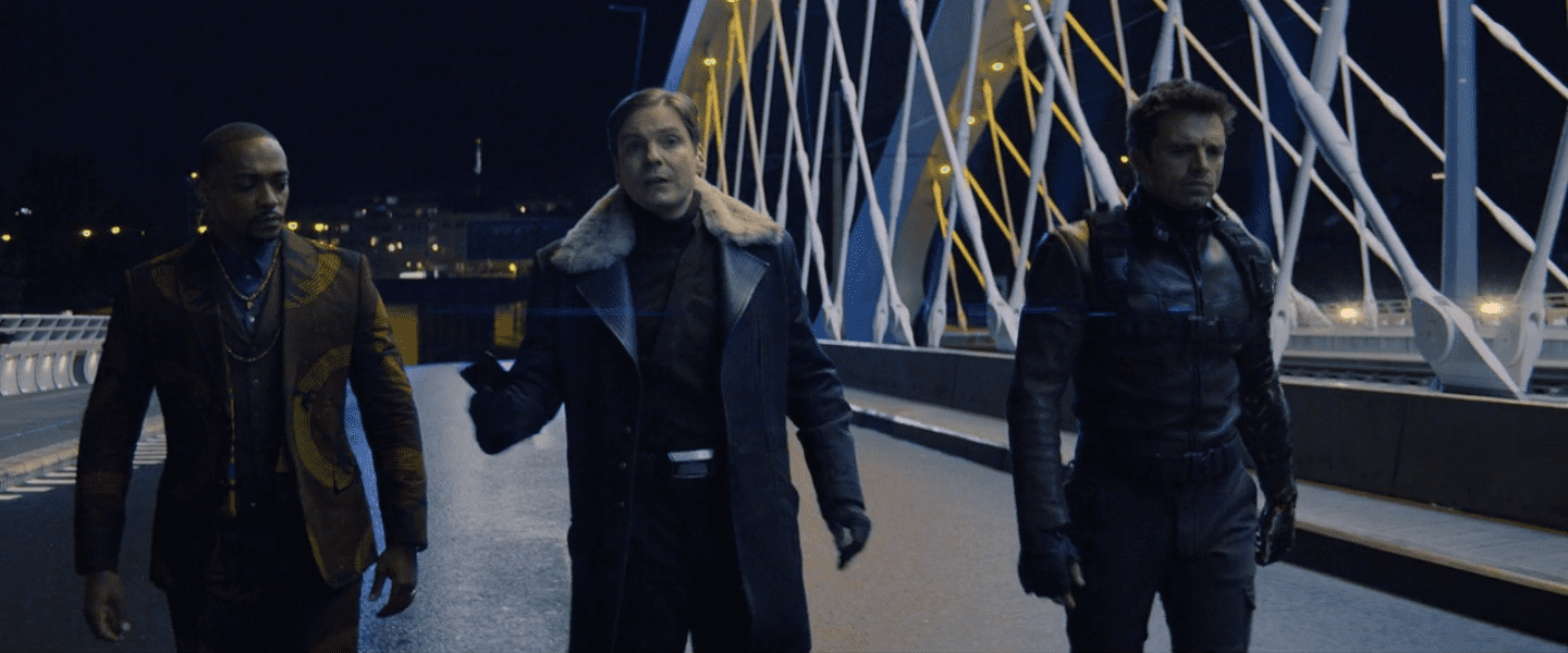 Ces défauts sont heureusement contrebalancés par de vraies qualités narratives et un rythme plus soutenu et moins haché que d’autres séries de Disney+. On pense évidemment à Wandavision, mais aussi au Mandalorian. Contrairement à ces deux séries, Falcon et le Soldat de l’Hiver ne s’éparpille pas trop, ne met pas trois épisodes à démarrer, ou ne part pas dans des quêtes parallèles qui n’ont rien à voir avec l’histoire principale. La série évite également tout manichéisme, avec des flagh smashers qui font office de robins des bois des temps modernes et qui suivent le schéma classique des personnages qui veulent bien faire mais qui finissent par tomber dans l’extrémisme. Rien qui relève du jamais vu, mais une orientation rafraichissante (surtout après Wandavision) et finement exécutée, avec des antagonistes plus ambigus qu’ils n’y paraissent. Ni antagoniste, ni complètement gentil, Zemo représente une des réussites de cet aspect. On aurait pu croire que les scénaristes retourneraient complètement leur chemise et lui donne une légitimé, mais il n’en est rien : les motivations du baron ont beau être claires dès le début, il restera ce personnage assez énigmatique et manipulateur jusqu’à la fin malgré son entrée dans l’équipe à la mi-saison. Il ne faudra en revanche pas s’attendre à des merveilles concernant son apparences masquée, la seule scène dans laquelle il enfile la fameuse cagoule tombant un peu comme un cheveu dans la soupe et apparaît plus comme un coup de coude obligatoire aux fans intransigeants du personnage qu’autre chose.